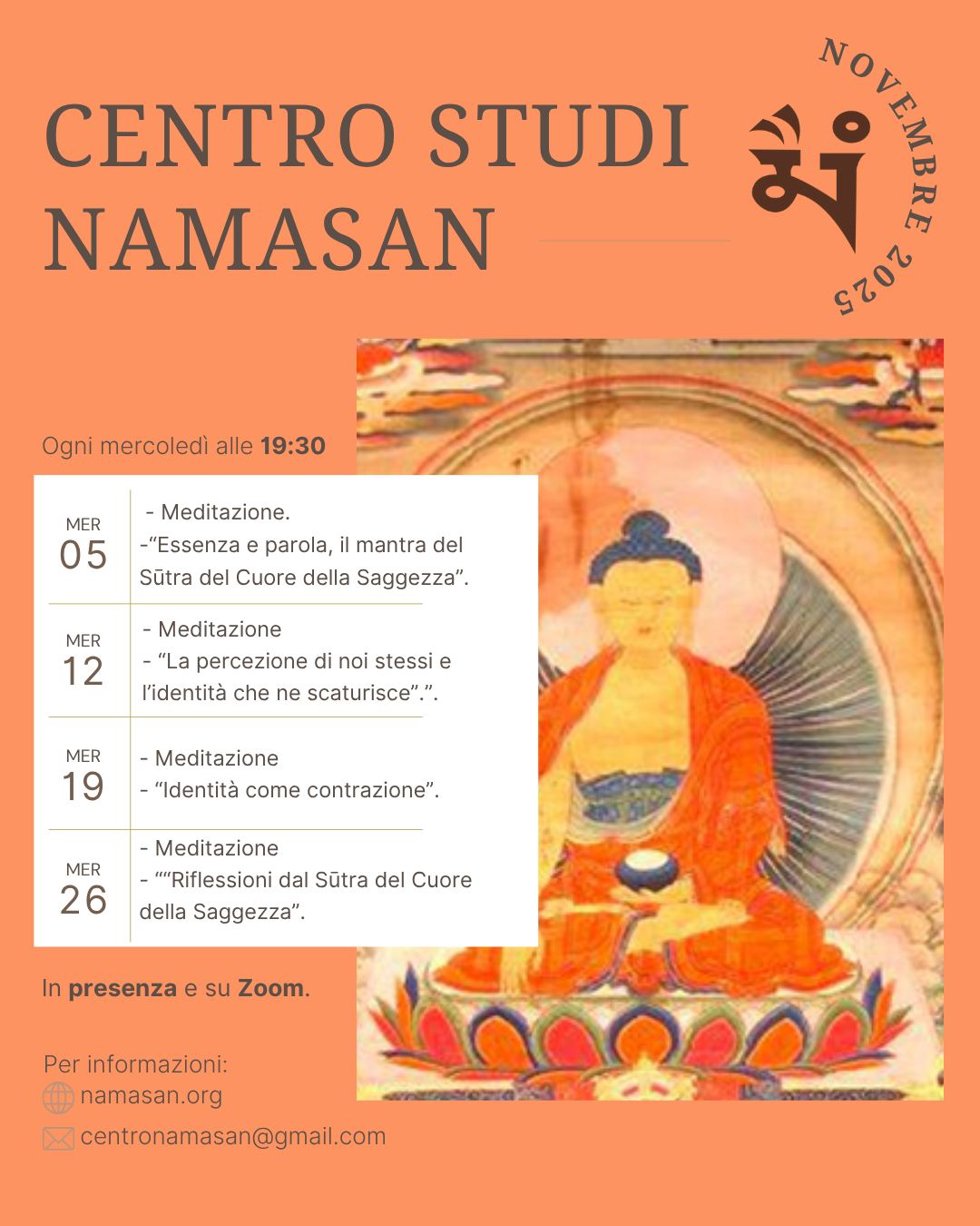 Psicologia Buddhista: la natura del sé, la natura della menteCorso tenuto dal docente Filippo LunardoGli appuntamenti del mese di Novembre 255 NovembreMeditazione.A seguire, discorso dal titolo “Essenza e parola, il mantra del Sūtra del Cuore della Saggezza”12 NovembreMeditazione.A seguire, discorso dal titolo “La percezione che abbiamo di noi stessi e l’identità…
